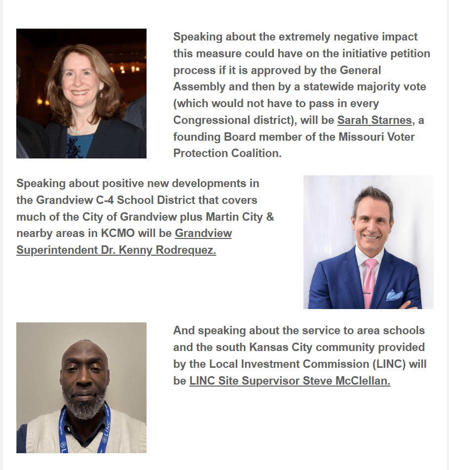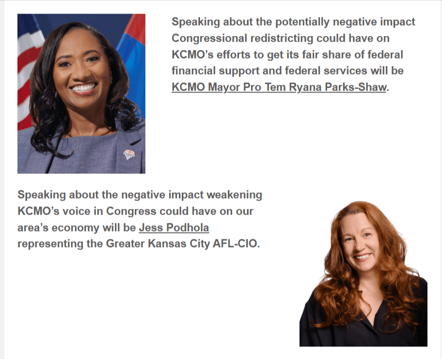 Please join us at 6 p.m. Monday, September 8, in the front building of the South Patrol Police Campus, 9701 Marion Park Dr., to hear representatives of KCMO and area business & labor groups warn of the danger of losing millions in federal funding for essential city services if the proposed plan to revise the boundaries of Missouri’s Congressional districts currently being considered by a special session of the Missouri General Assembly that began today is approved.